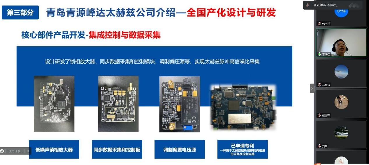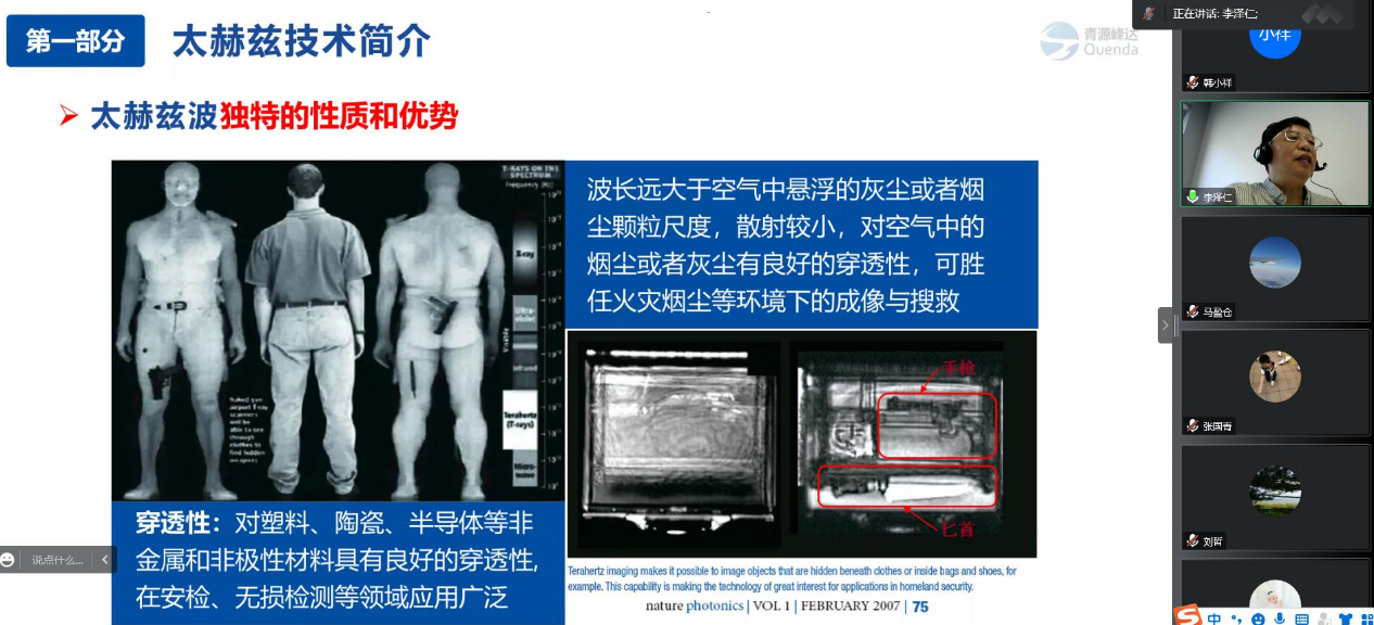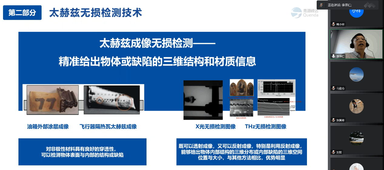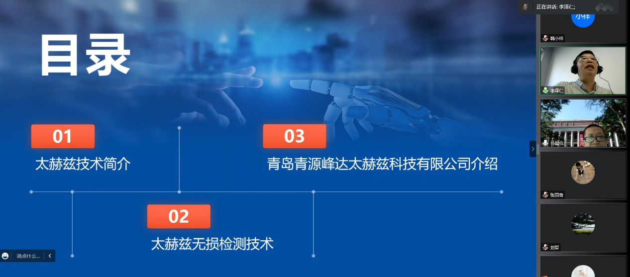 李泽仁教授报告内容涉及太赫兹波的独特性质和优势,太赫兹技术的战略意义,基于透射成像和反射成像的太赫兹无损检测技术原理,太赫兹无损检测技术在军事、航空航天、安全检查、工业制造等领域的应用和青岛青源峰达太赫兹科技有限公司的介绍。此外,围绕具体的太赫兹技术,以及加强本院与青岛青源峰达太赫兹科技有限公司的产学研合作等问题,李教授与我院师生开展了深入的讨论交流。