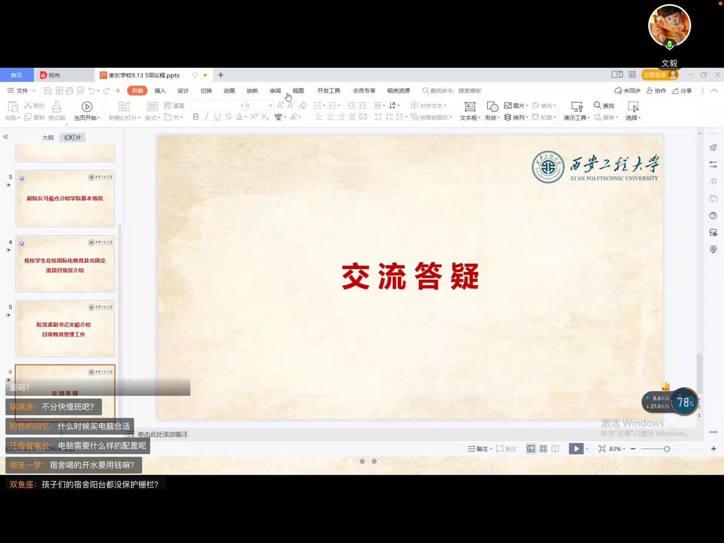 文毅就学院专业设置、日常管理、奖助体系、学生就业、心理健康、大学规划等方面做了详细介绍,并提出几点建议:一是希望家长们要转变思想认知。进入大学仍要继续关注孩子的思想学习心理等,引导学生积极参加校园文化活动和科技类竞赛,鼓励孩子不负韶华、不负初心;二是希望家长们关注学生在大学阶段的发展。引导孩子自主思考、自主解决问题,在困难与挫折的考验下逐步积累生活的经验,上好大学的人生大课;三是希望家长们要配合学校的工作和教育,并同时保持和孩子的沟通,关注孩子的心理健康,帮助他们尽快适应大学生活,与学校共同促进孩子成长,共同培育德才兼备,身心健康的栋梁之才。