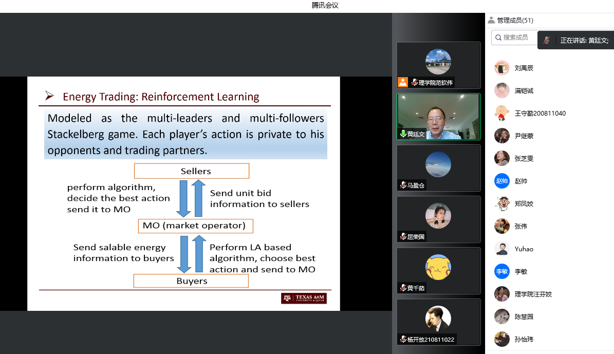 2022年08月12日下午,美国德州农工大学卡塔尔分校黄廷文教授应邀作了题为“Some Optimization Problems in Smart Grid”的线上学术报告。报告由suncitygroup太阳集团副院长马盈仓教授主持。suncitygroup太阳集团50余名师生出席了本次学术报告。