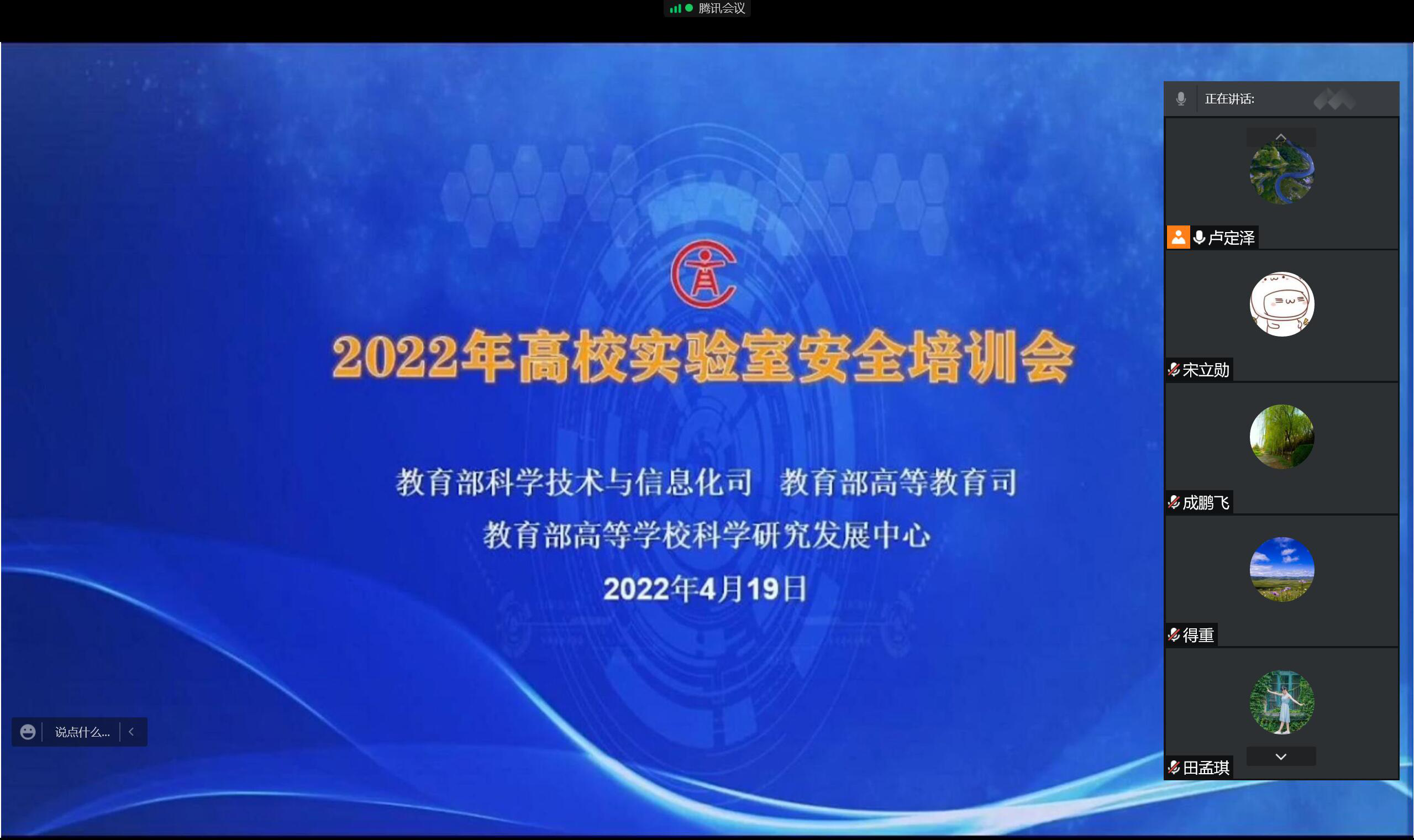 为落实全国高等学校实验室安全工作会议精神和《教育部办公厅关于组织开展2022年高等学校实验室安全检查工作的通知》,确保我院实验室常态化疫情防控安全运行,保障广大师生人身安全和学院稳定,4月19日上午,suncitygroup太阳集团组织我院相关人员通过腾讯会议参加教育部2022年高校实验室安全培训线上会议,学院副院长成鹏飞教授、物理实验中心主任刘汉臣教授等三十余人参加了本次培训会。