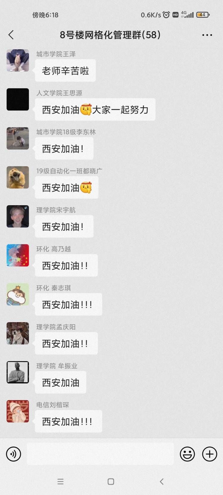 学院党政领导坚决站在防控疫情最前线,第一时间赶往临潼校区,靠前指挥、精准施策,动员全院教师协同“战疫”,形成上下一条心、全院一盘棋的工作合力,并加入到家属区、社区的志愿服务工作中;学工、团委、兄弟学院支持协作,院学工办主任文毅带领全体辅导员一起进驻8号学生公寓辅导员工作站,全力负责7个学院1490名研究生、本科生的日常教育管理服务,成立包抓工作组,摸清学生底数,织牢织密“楼长-层长-网格长-舍长”四级网格化管理制度;强化党员先锋岗队伍、优化网格员队伍、组建第二批突击队员队伍,不断强化组织力量;组织队伍专职为隔离学生定点送餐;组织包楼辅导员老师和楼内学生观看战疫思政大课,增强自信心。
