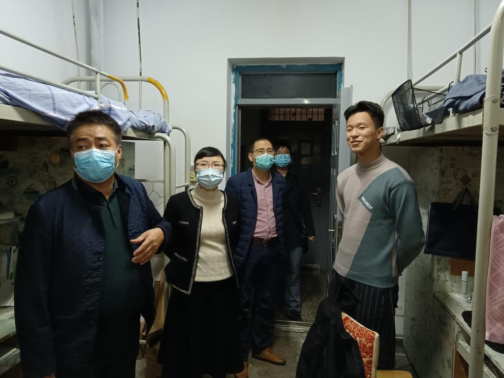 宿舍中,陈宣、夏蔡娟分别与学生进行交流,了解学生近期的思想状况,检查宿舍卫生、用电安全情况,并对上网课的情况和问题进行了解,嘱咐同学们遵守学校疫情防控相关规定,养成良好生活习惯,保持宿舍勤通风、勤打扫,在宿舍区不聚集、不串门,戴好口罩,做好防护。同时提醒同学们尽快调整状态,适应网课的学习生活。学生们一一回答了老师们的问题,对老师到宿舍看望他们表示感谢,还表示会积极配合并严格遵守疫情防控相关规定,共克时艰。