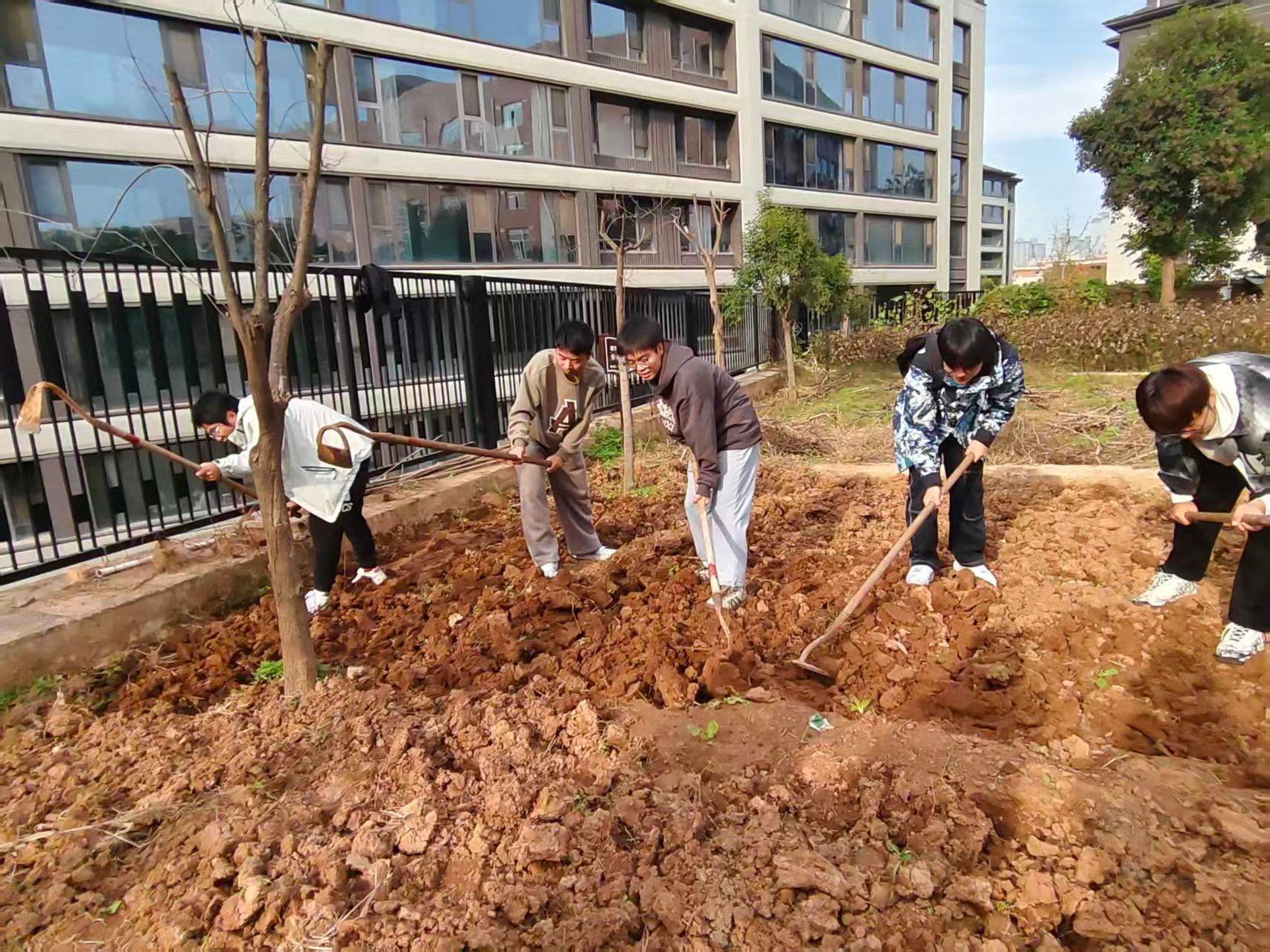 活动中,花房师傅向同学们详细介绍油菜花的生长特性、栽培技巧及各种农具操作规范并现场进行耕地劳动技巧的示范。随后,同学们以小组为单位戴上手套、手持铁锹、锄头、铁耙等农用工具有条不紊地投入到劳动中。经过清除田地杂草、翻耕平整土地、播撒油菜籽、施用基肥和覆盖表土等农耕实操,顺利完成了播种油菜花的任务。尽管汗水湿透了衣衫,泥土沾满了裤脚,但现场不时传出欢声笑语,气氛热烈而融洽,不仅为我院耕读小园“责任田”带来了活力与生机,大家也切身感受到农耕劳作的艰辛与乐趣。