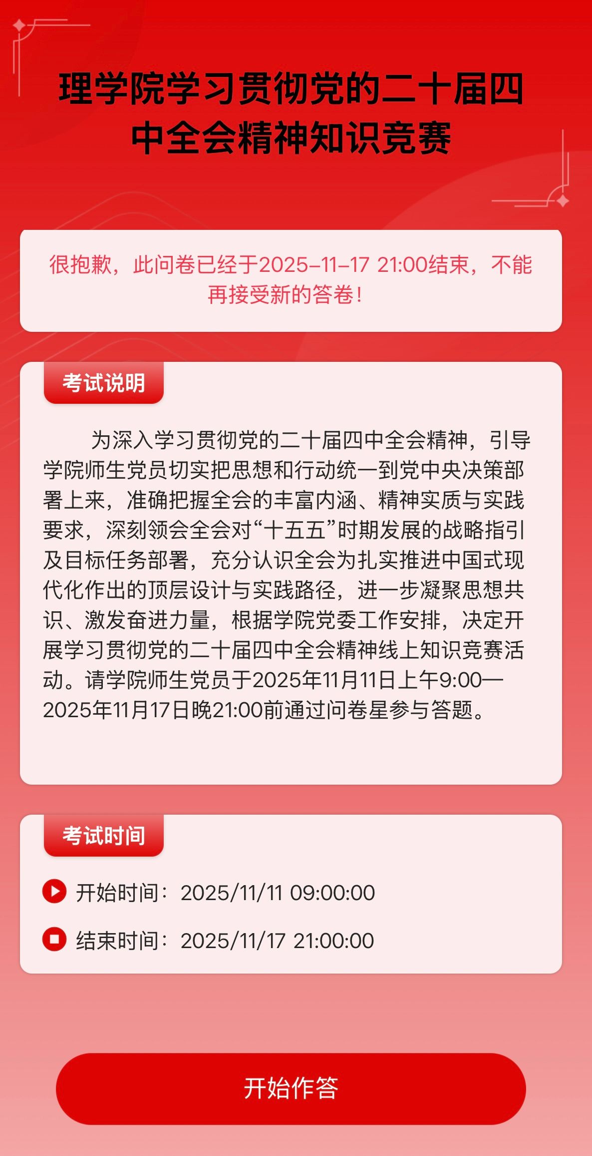 11月11日至17日,suncitygroup太阳集团成功举办“学习贯彻党的二十届四中全会精神”线上知识竞赛,旨在推动党的二十届四中全会精神在学院落地生根、入脑入心,创新理论学习载体,引导师生将思想共识转化为育人实效与科研动力。学院全体师生党员热情高涨、踊跃参与,反响热烈。