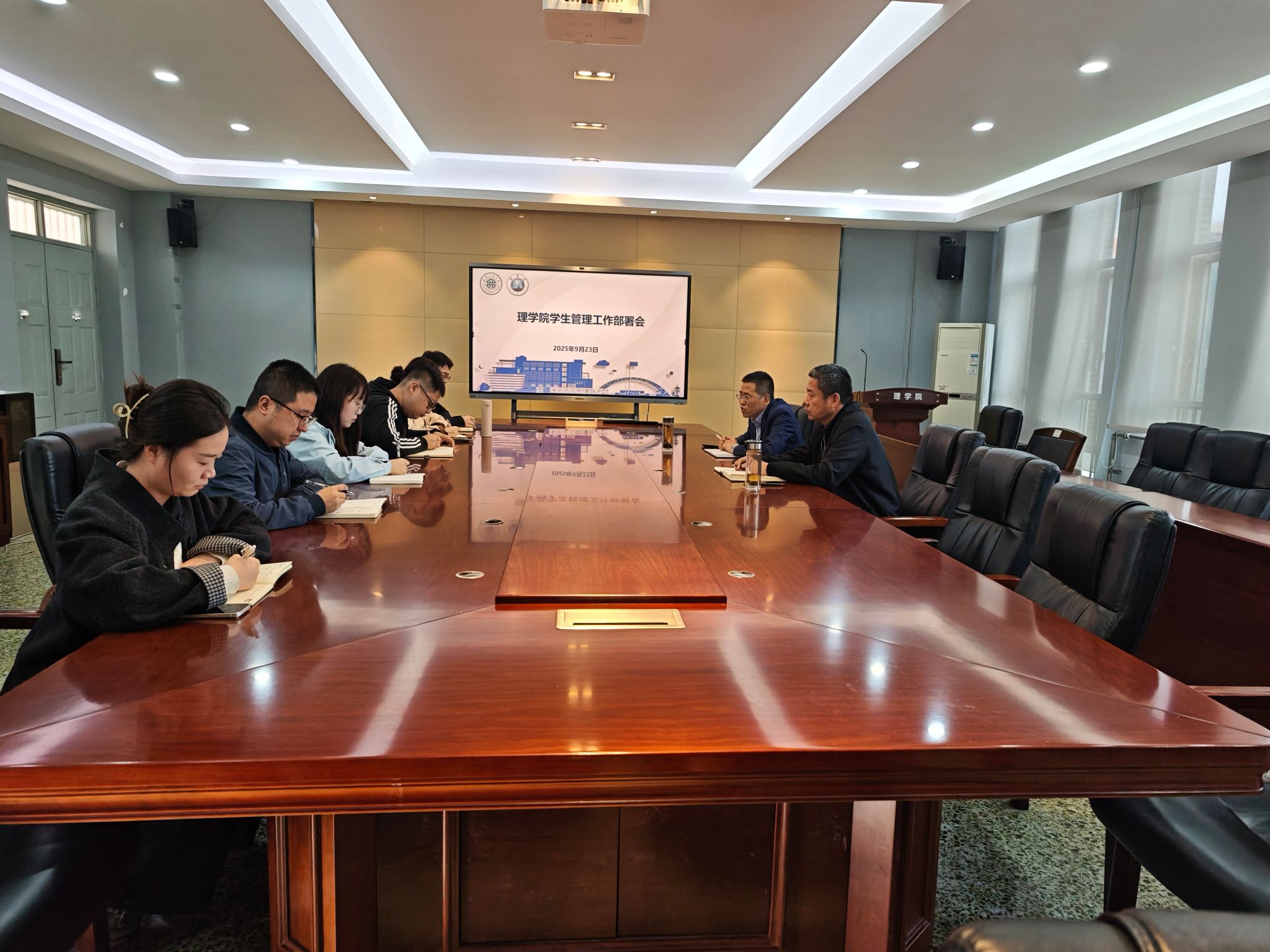 文毅简要总结了新学期开学以来学院学生工作开展情况,指出了工作中值得肯定之处和存在的不足,汇报了近期学生工作总体思路,对学生思想政治教育、学风建设、就业指导、心理健康教育、校园文化活动等重点工作进行了全面部署,明确了各项任务的责任人、时间节点和具体要求。