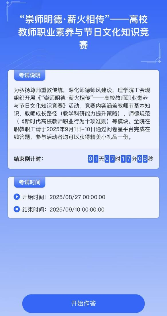 金秋九月,丹桂飘香,我们迎来了第41个教师节。为弘扬中华民族尊师重教的优良传统,深化师德师风建设,suncitygroup太阳集团工会于2025年教师节期间特别推出《"崇师明德·薪火相传"——高校教师职业素养与节日文化知识竞赛》活动。本次知识竞赛内容丰富、形式新颖,涵盖教师节历史文化知识、教师专业发展路径、教学科研能力提升策略以及《新时代高校教师职业行为十项准则》等师德规范内容。活动旨在通过以赛促学的方式,增强全院教职工的职业荣誉感和使命感,提升教师的综合素养。