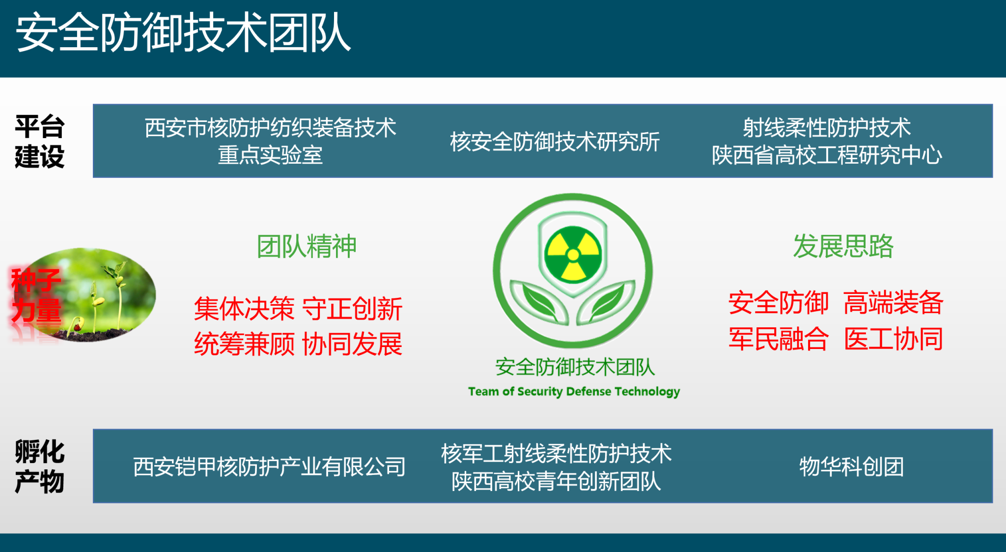 安全防御技术团队是在核武器效应及防护研究基础上组建的联合团队,其面向国家重大战略需求、面向人民生命健康,聚焦射线防护及其有关的工程应用问题,以解决防护、洗消和评估关键技术问题为核心任务,坚持走军民融合、医工协同的双战略路线,旨在核防护产业领域建成西北一流的科技创新、成果转化、人才培养的基地。